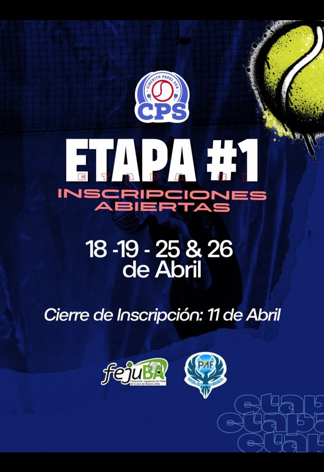 »» Evento: CIRCUITO PADEL SUR - CPS - ETAPA 1/2026 - »» Localidad: El Jagüel | Esteban Echeverría | Ezeiza | Lomas de Zamora | Luis Guillon »» Fechas: 18/04/2026 al 26/04/2026